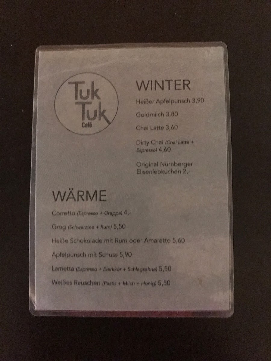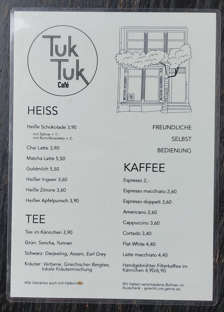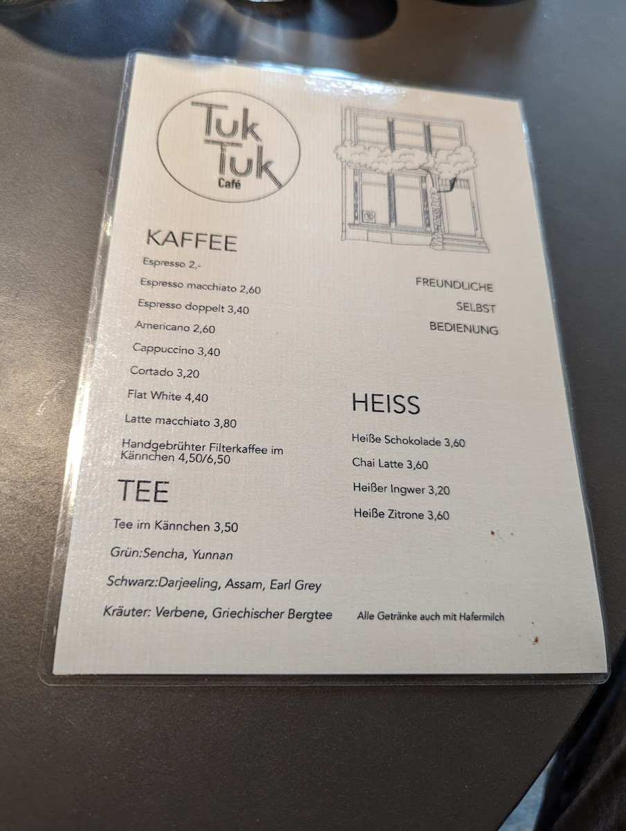 The menu at TUK TUK Café offers a selection focused primarily on coffee beverages and accompanying light food options. Visitors can expect a variety of specialty coffee drinks suited for coffee breaks or casual meetups. In addition to beverages, the menu includes pastries and simple baked goods, which complement the drinks and serve as light snacks or breakfast items.
